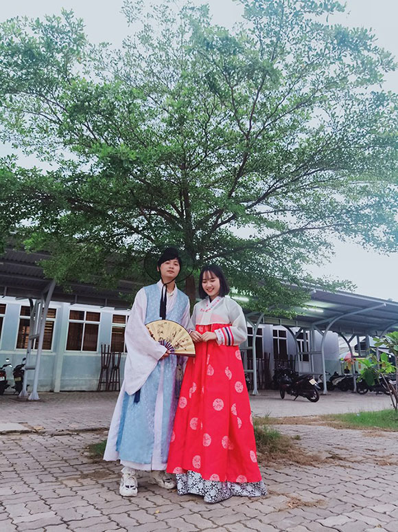 Nguyễn Trọng Phụng và Đinh Gia Hân trong trang phục truyền thống của Hàn Quốc