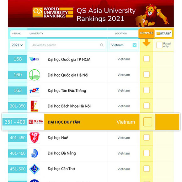 Theo Bảng xếp hạng mới nhất do QS (Quacquarelli Symonds - Vương quốc Anh) công bố, Việt Nam có 11 cơ sở giáo dục đại học lọt vào bảng xếp hạng các đại học tốt nhất khu vực châu Á năm 2021. Theo thứ tự xếp hạng bao gồm: 1. ĐH Quốc gia Tp. Hồ Chí Minh, 2. ĐH Quốc gia Hà Nội, 3. Trường ĐH Tôn Đức Thắng, 4. Trường ĐH Bách khoa Hà Nội, 5. Trường ĐH Duy Tân, 6. ĐH Huế, 7. ĐH Đà Nẵng, 8. Trường ĐH Cần Thơ, 9. Trường ĐH Sư phạm Hà Nội, 10. Trường ĐH Công nghiệp Tp. Hồ Chí Minh, và 11. Trường ĐH Kinh tế Tp. Hồ Chí Minh. Trong đó, Trường ĐH Duy Tân tăng hơn 100 hạng, vào Top 351-400 trường đại học tốt nhất châu Á và đứng vị trí thứ 5 trong tổng số 11 cơ sở giáo dục của Việt Nam được QS xếp hạng.