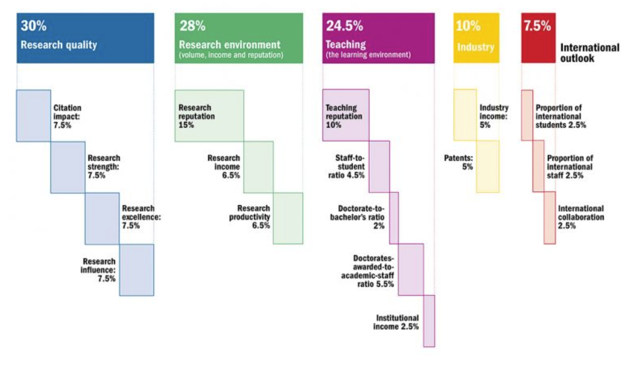 - Research Quality (30%): Introduced in 2024, this expanded category includes citation impact, research strength (field-weighted impact), research excellence (top 10% most-cited papers), and broader research influence.